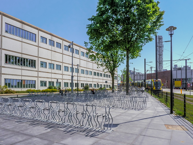 Klaver Bicycle Parking has realised a new bicycle parking facility at the main entrance of the hospital UMC Utrecht. Namely the Cobra Light bicycle stands and a CuBic bicycle stand.